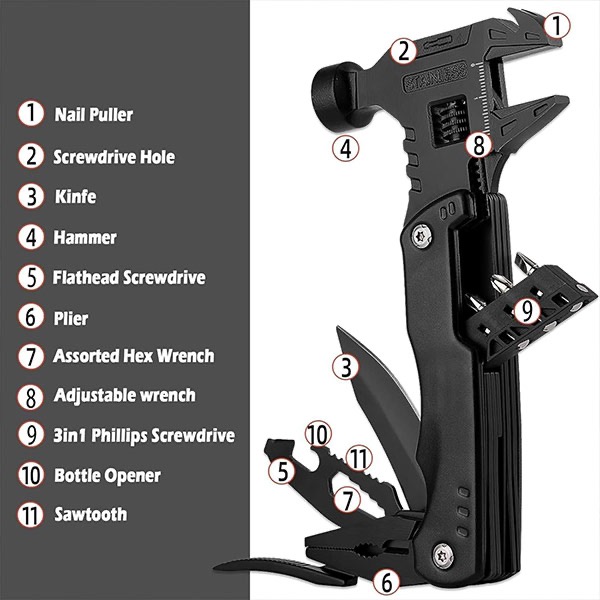 HAMPER integruje 16 praktických funkcií do jedného ručného nástroja, vďaka čomu je ideálny na opravy, nastavenia a rýchle zásahy 😊 Vždy máte po ruke to, čo potrebujete, či už pracujete doma alebo ste v prírode.