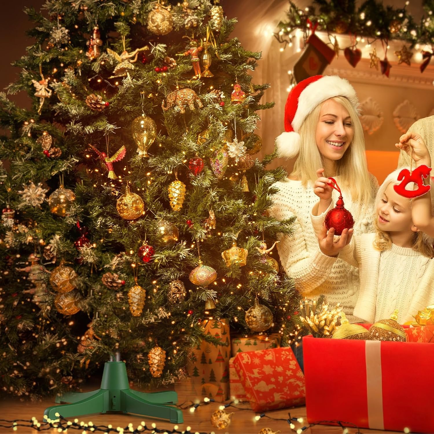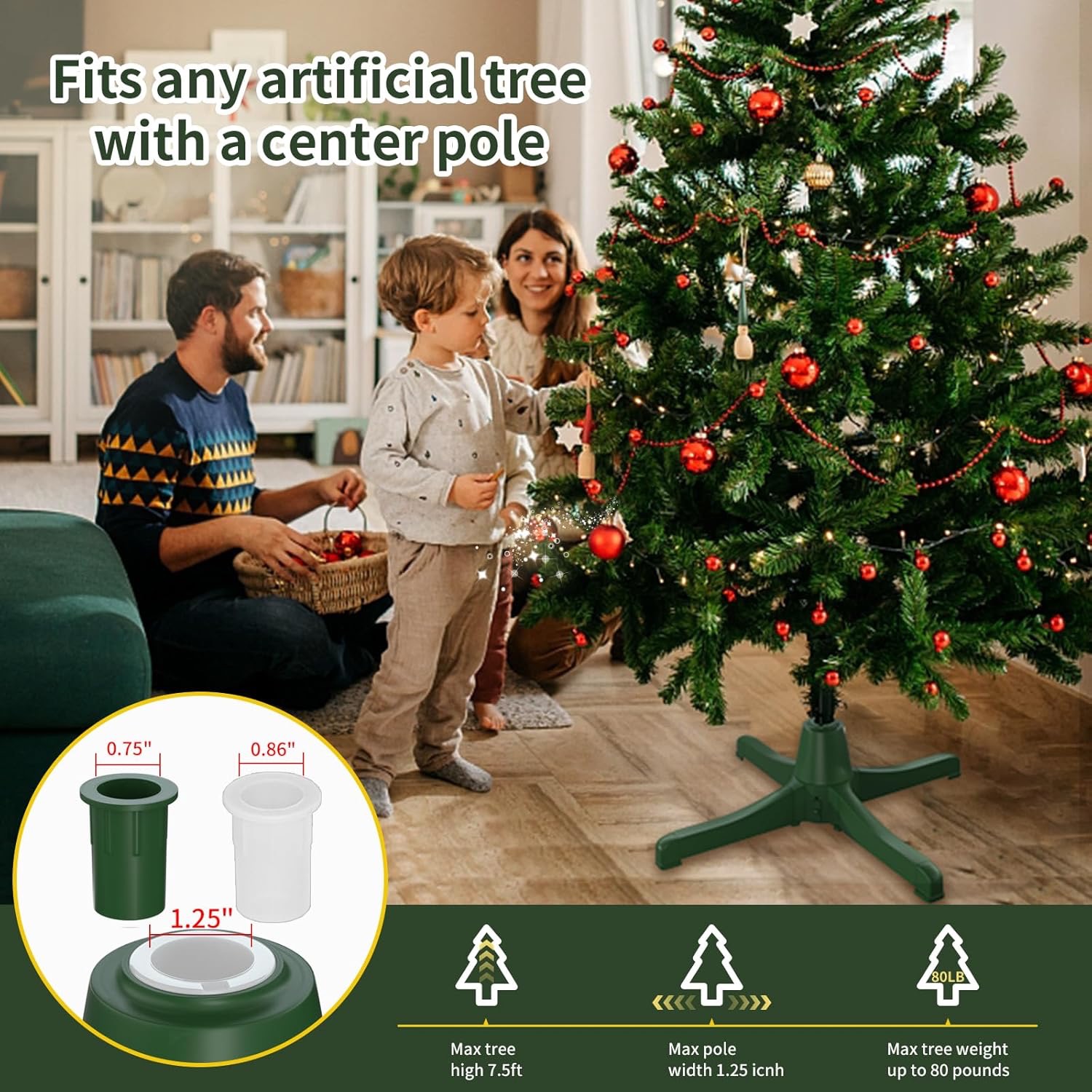 Stojan je vyrobený z pevných a spoľahlivých materiálov a pasuje na kmene s priemerom približne 2,3–3,2 cm. Udrží váš vianočný stromček vzpriamene, v rovnováhe a perfektne umiestnený pre rotáciu, čím zabezpečí bezpečné a atraktívne vystavenie počas celej sezóny.