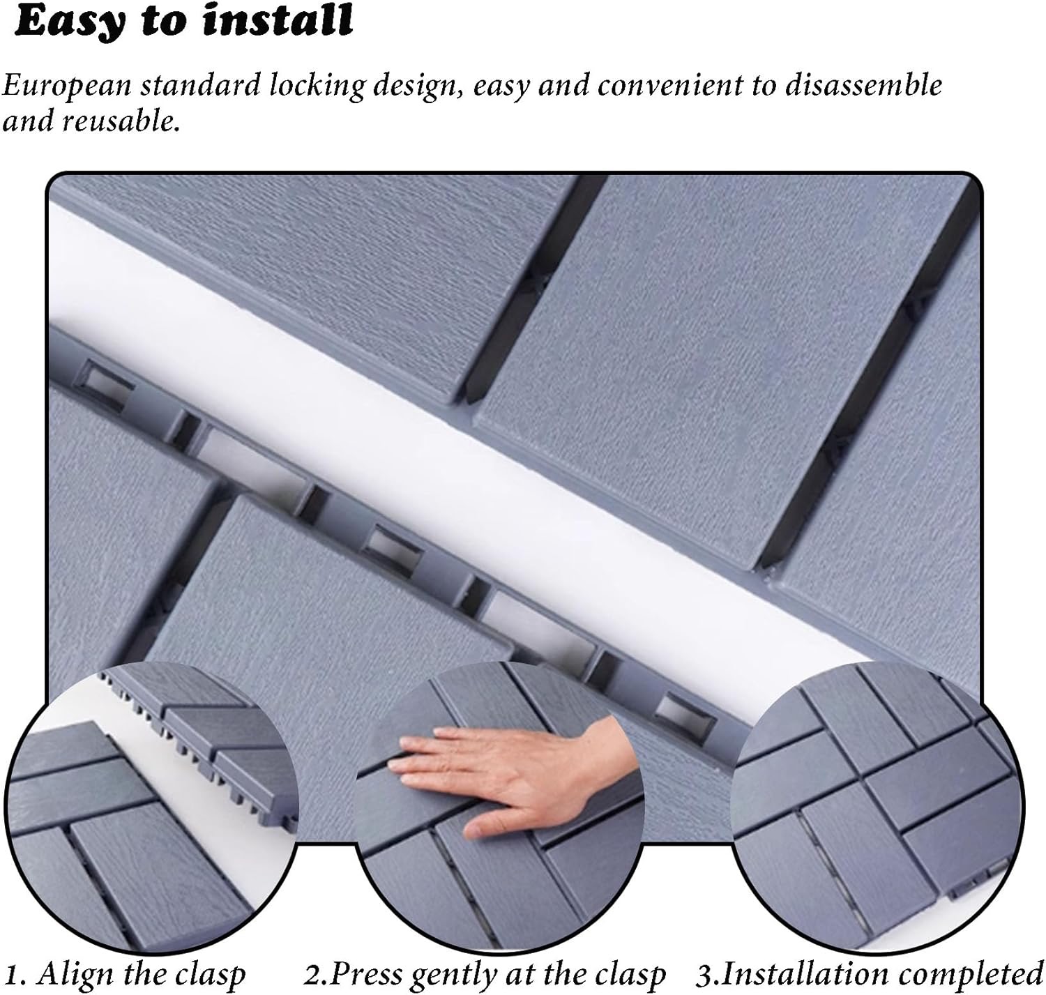 Vďaka zacvakávaciemu systému možno dlaždice zložiť alebo rozobrať bez použitia náradia. Možno ich tiež rezať tak, aby pasovali do úzkych alebo nepravidelných priestorov, čo z nich robí ideálne riešenie na balkóny, terasy, do záhrad, k bazénom, na chodníky a vonkajšie detské ihriská.