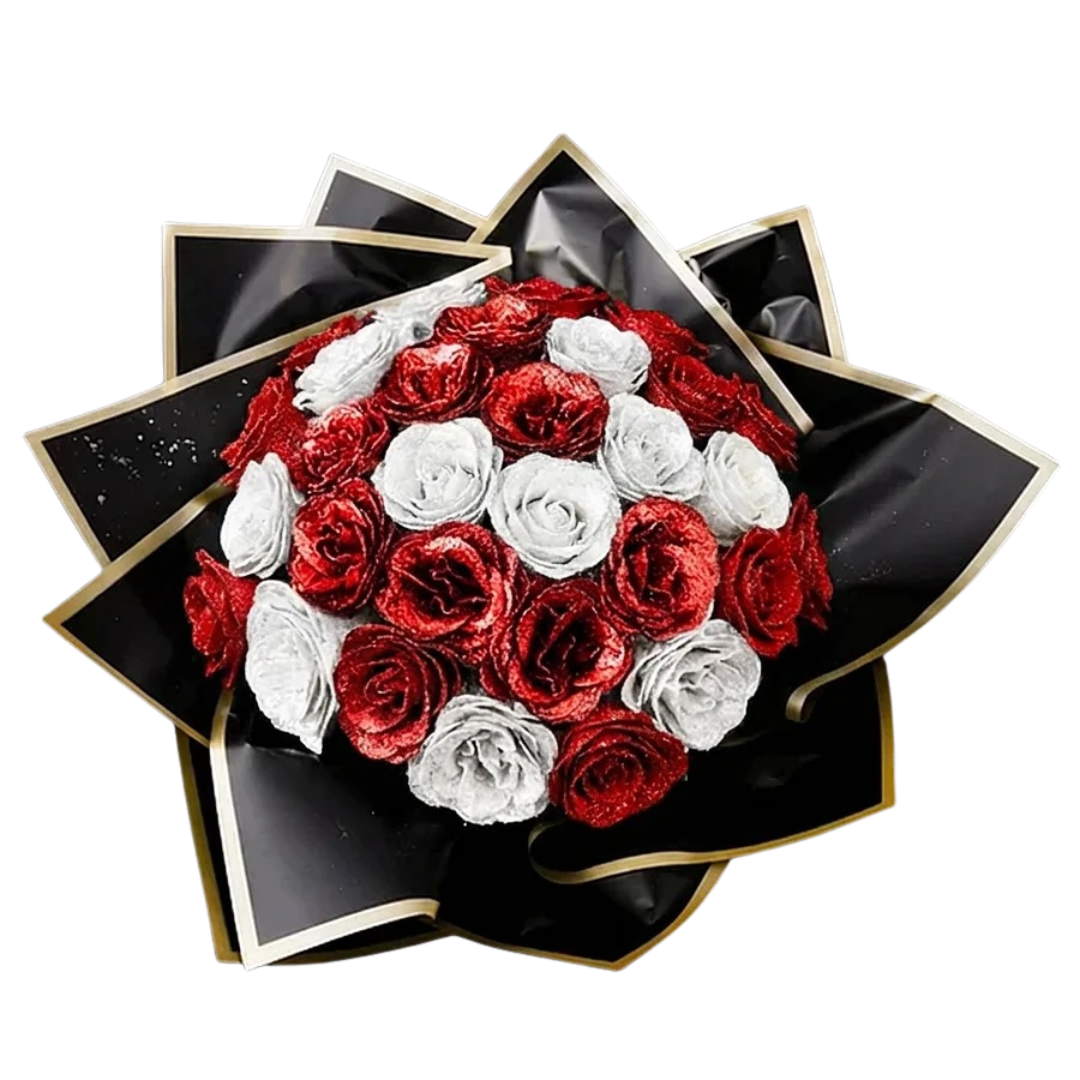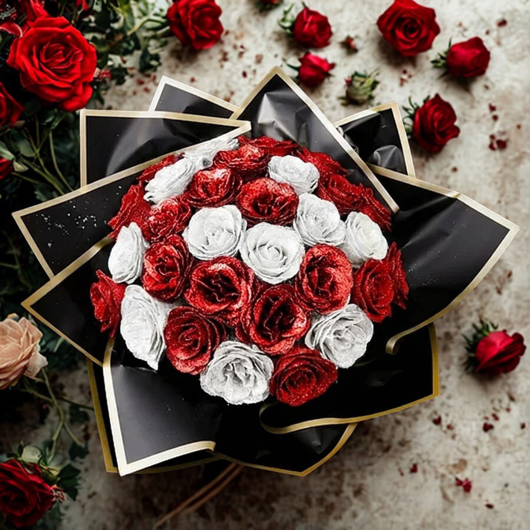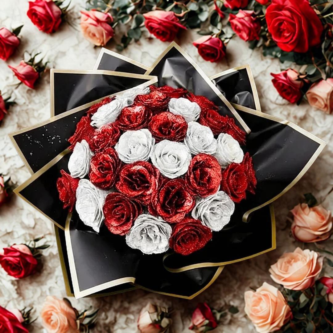 Každá ruža v tejto kytici je starostlivo ručne vyrobená z kvalitnej stužky, s jemne poskladanými lupienkami a precízne zatočenými detailmi. Jemné trblietanie stužky vytvára uhladený a výrazný efekt, vďaka ktorému kytica pôsobí luxusne a skutočne výnimočne.