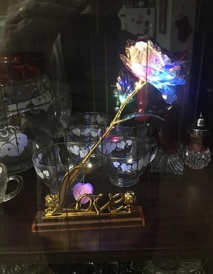 Ruža má úžasnú holografickú povrchovú úpravu, ktorá odráža svetlo v žiarivých dúhových tónoch a vytvára fascinujúci žiarivý efekt ako galaktická obloha 😊 Nádherne sa leskne z každého uhla, vďaka čomu je skutočne nezabudnuteľným dekoratívnym kúskom.